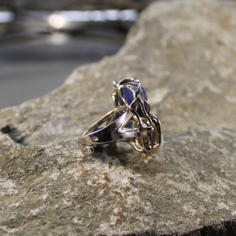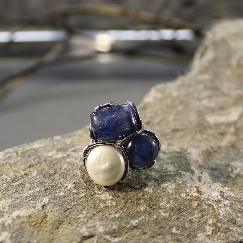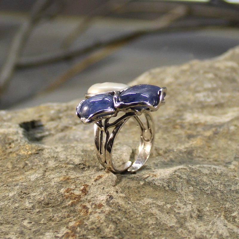 Srebrni prsten s biserom, mjesečevim kamenom i plavim ahatom.