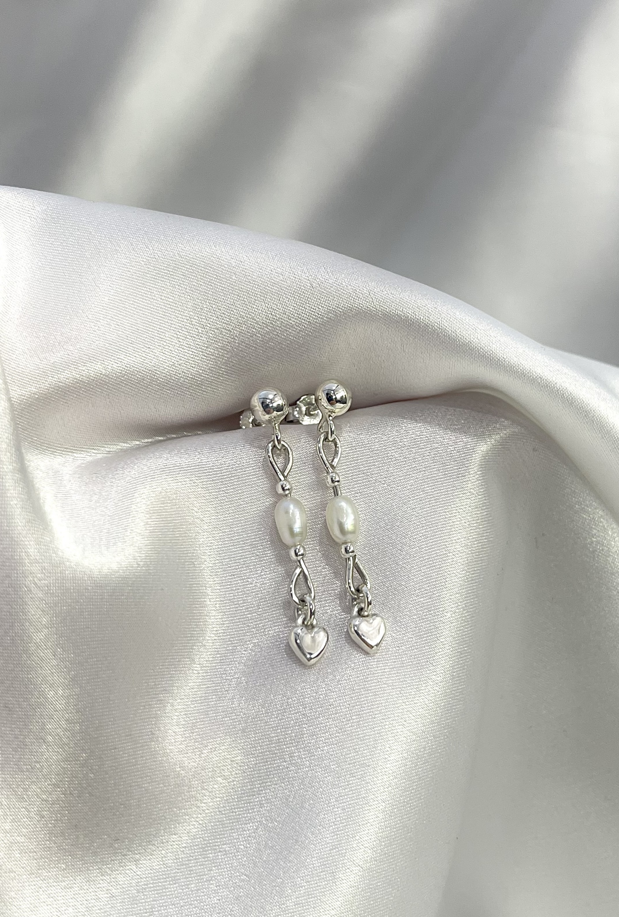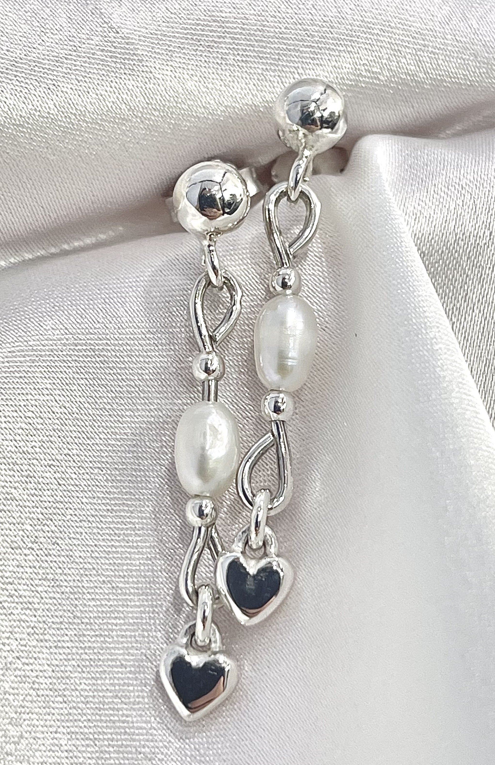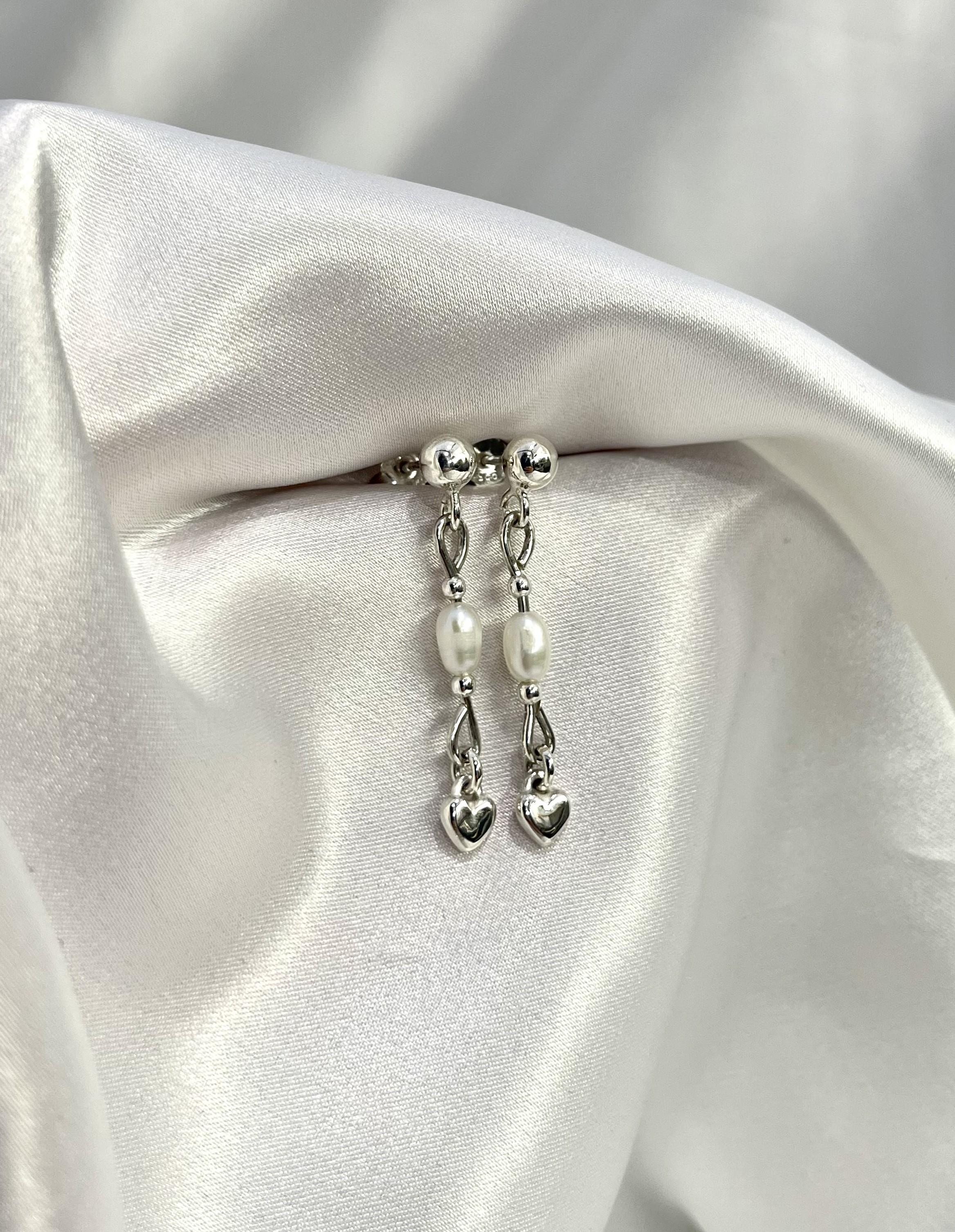 Srebrne viseće naušnice sa slatkovodnim biserima, srebrnim srcima i kuglicama.