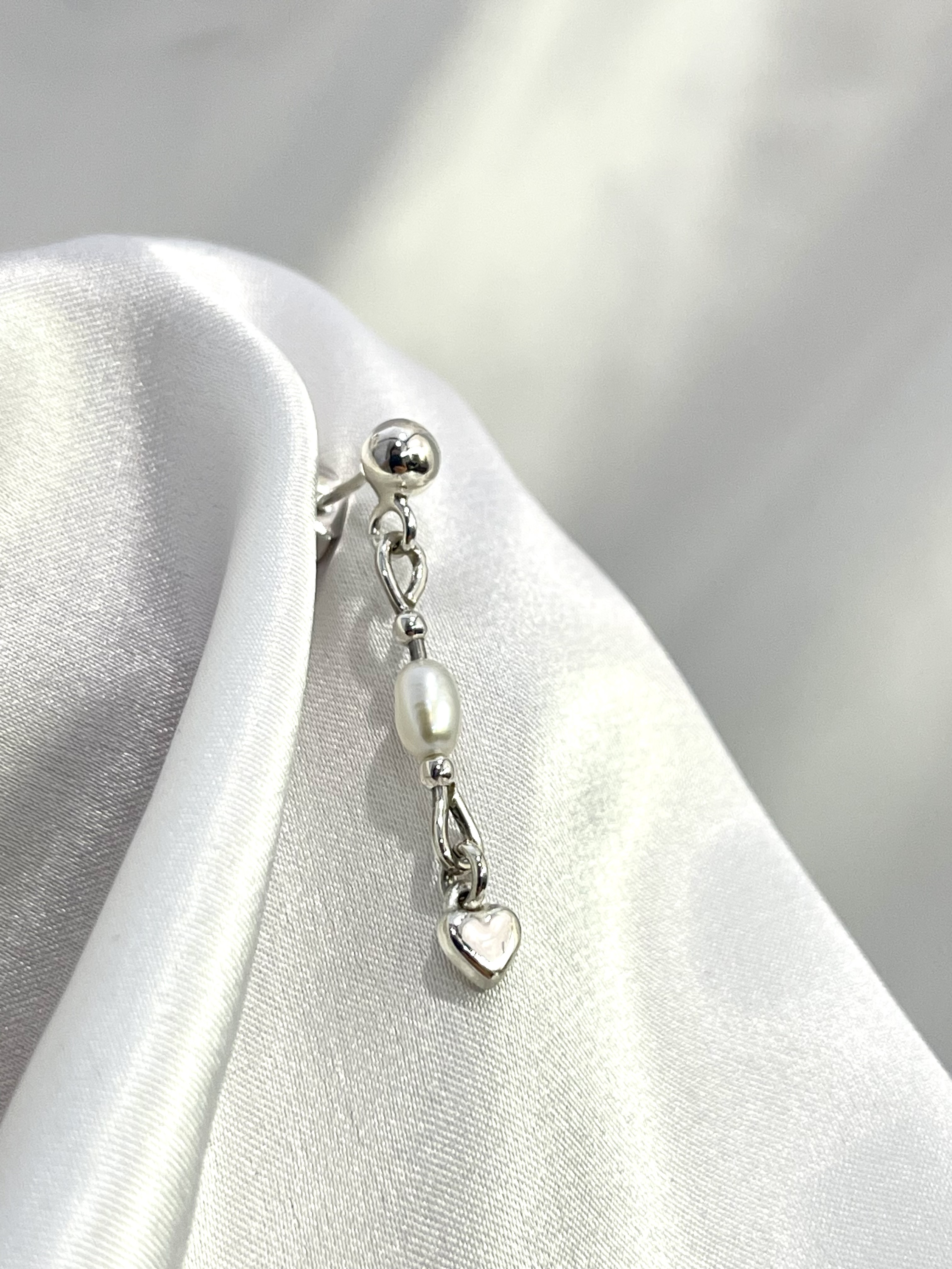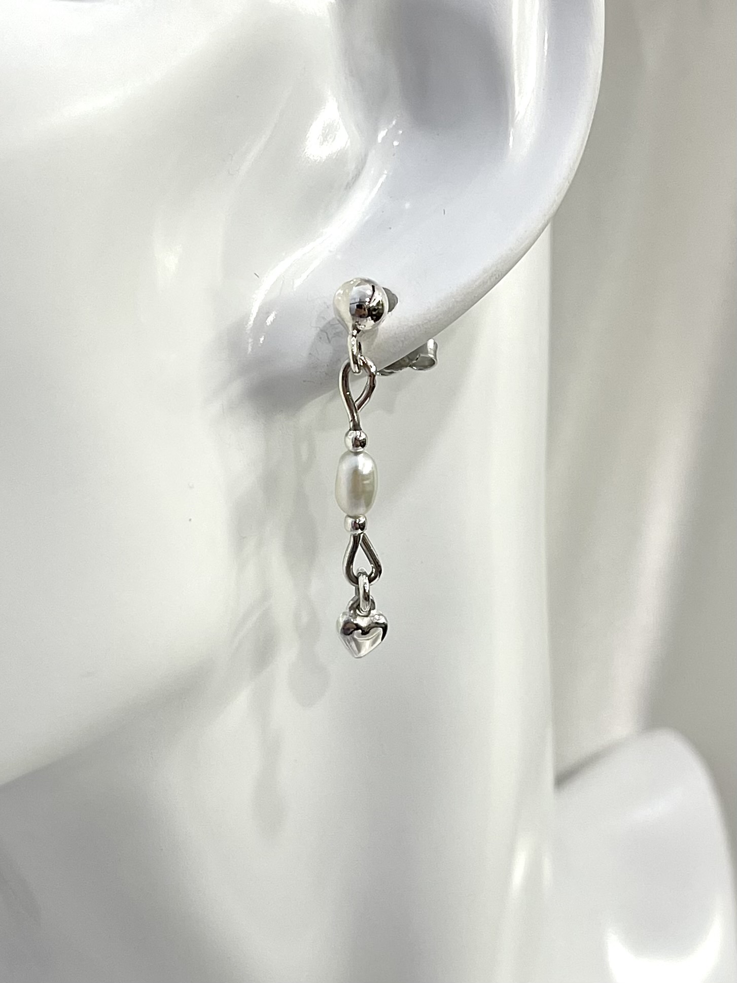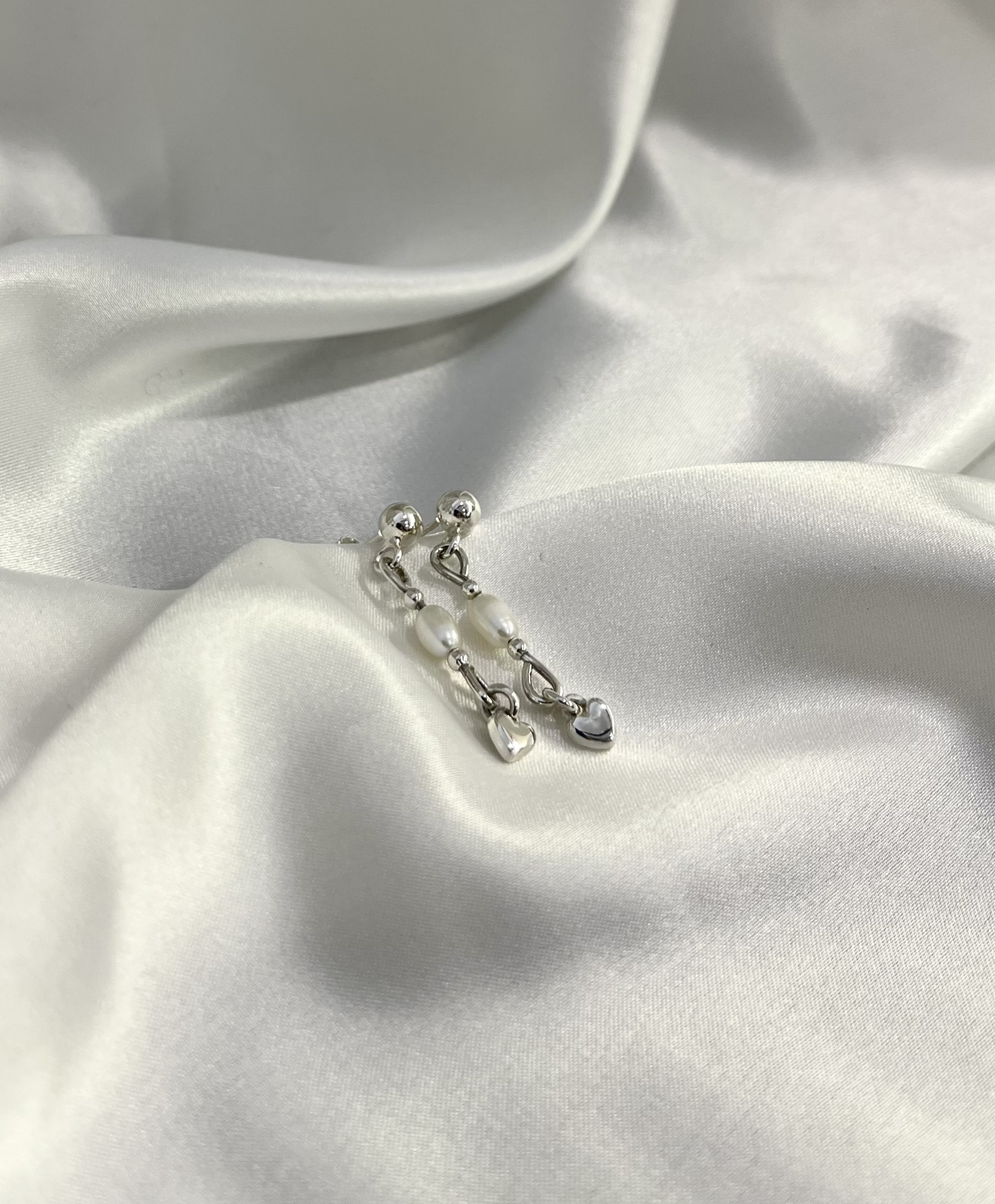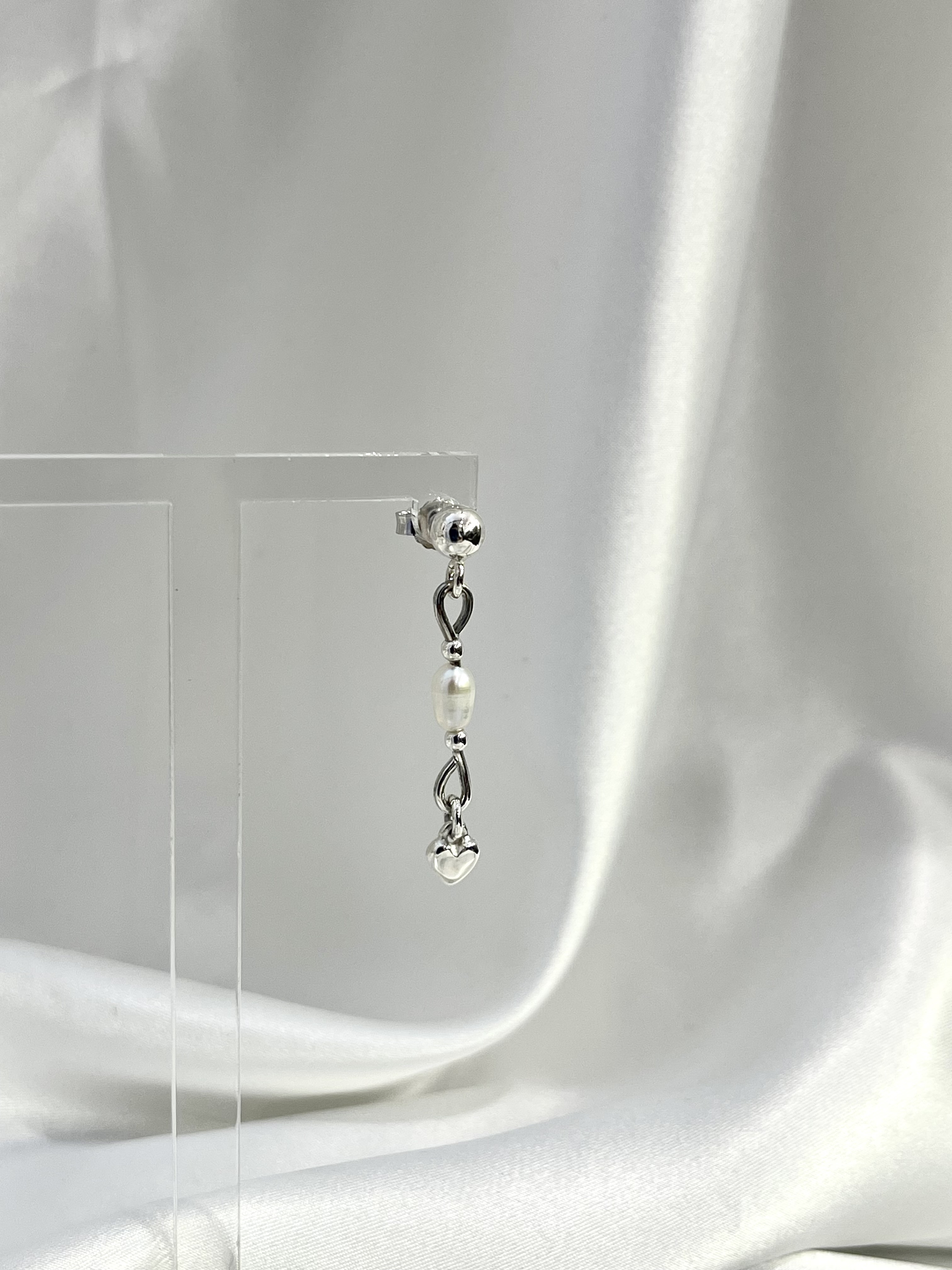 Srebrne viseće naušnice sa slatkovodnim biserima, srebrnim srcima i kuglicama.